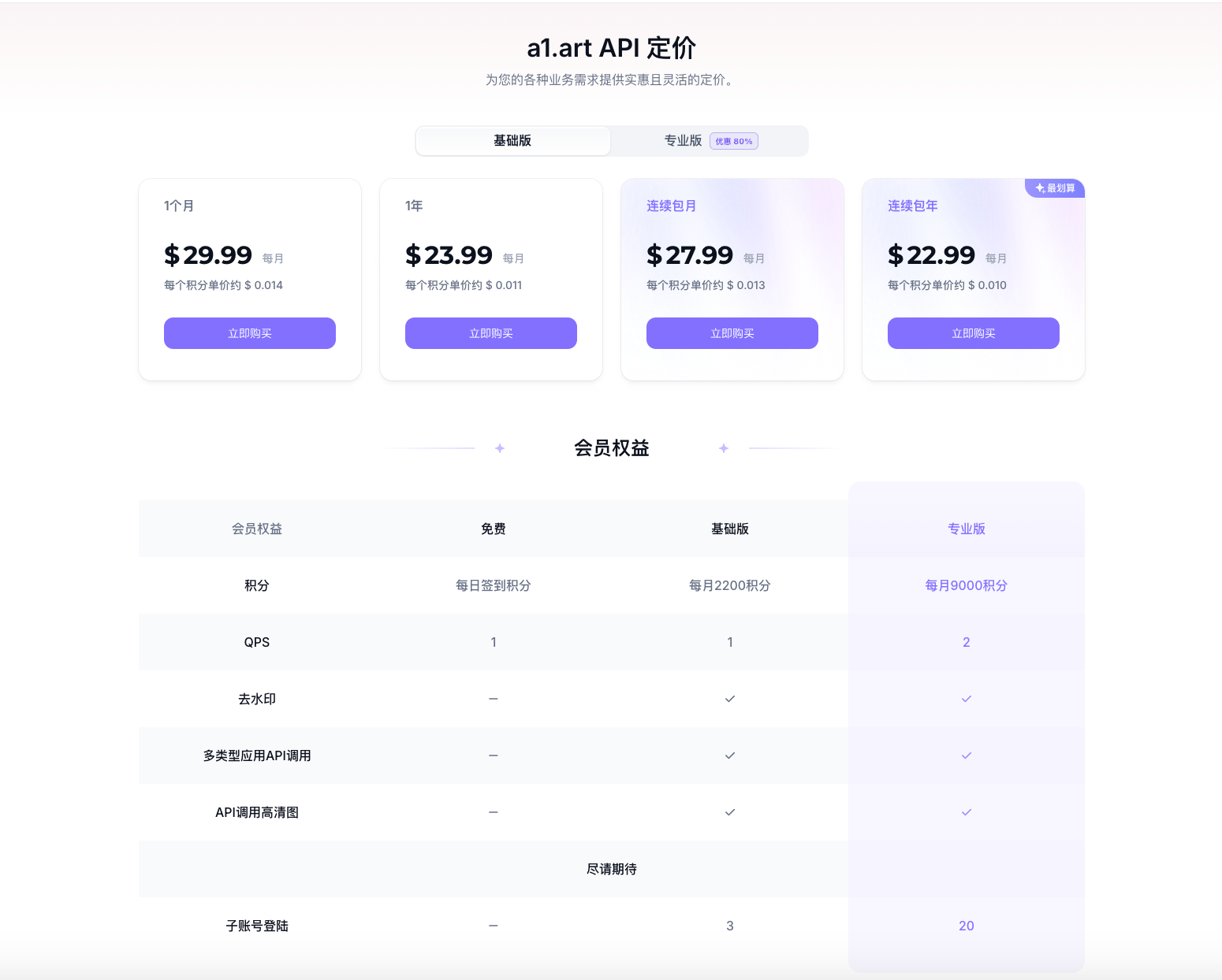 更多订阅相关内容[请参阅](https://a1.art/zh/ai-image-generator-api)